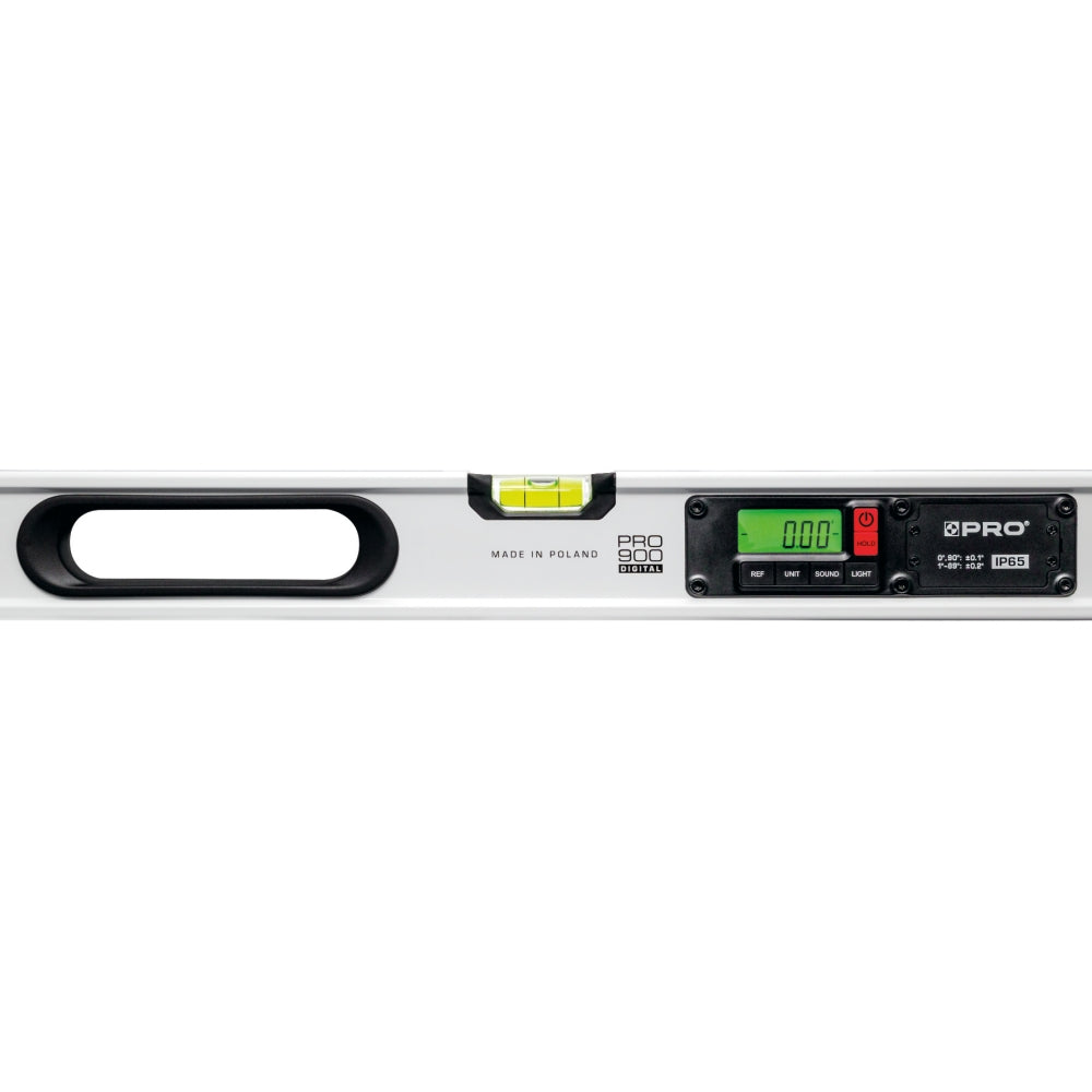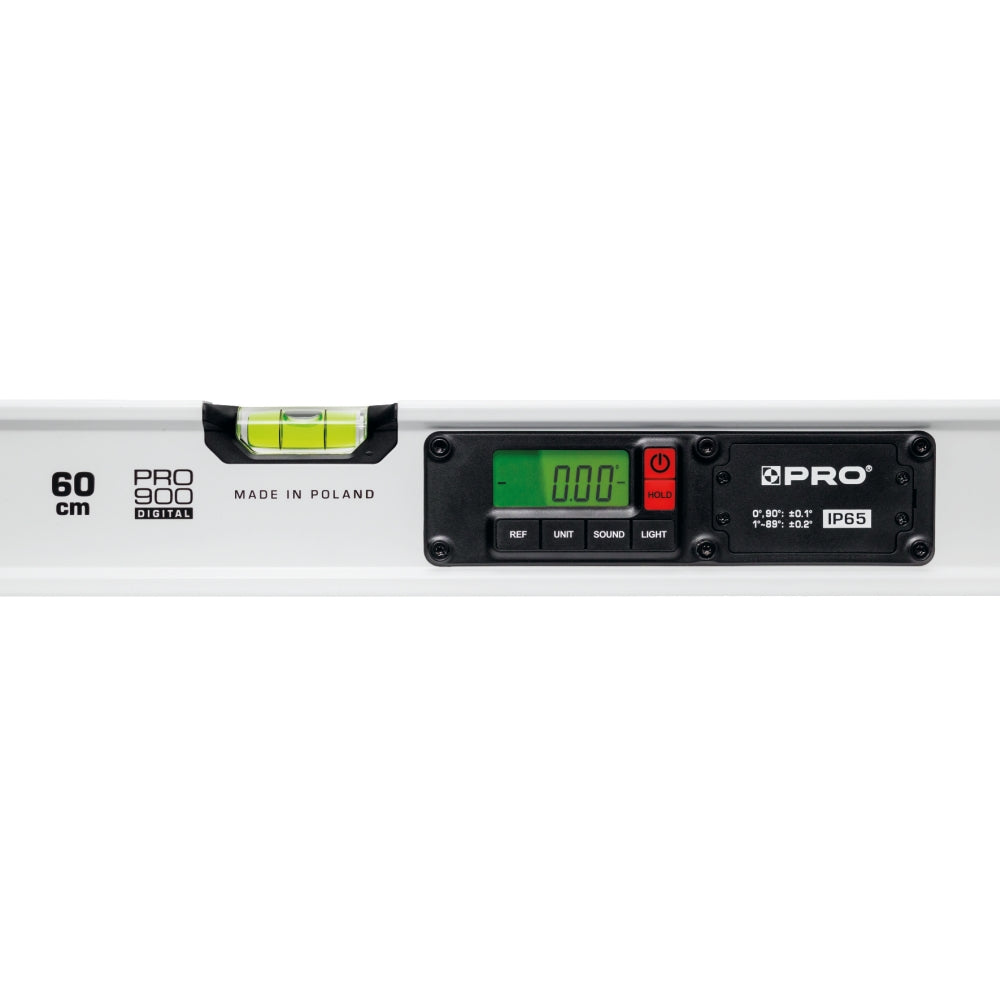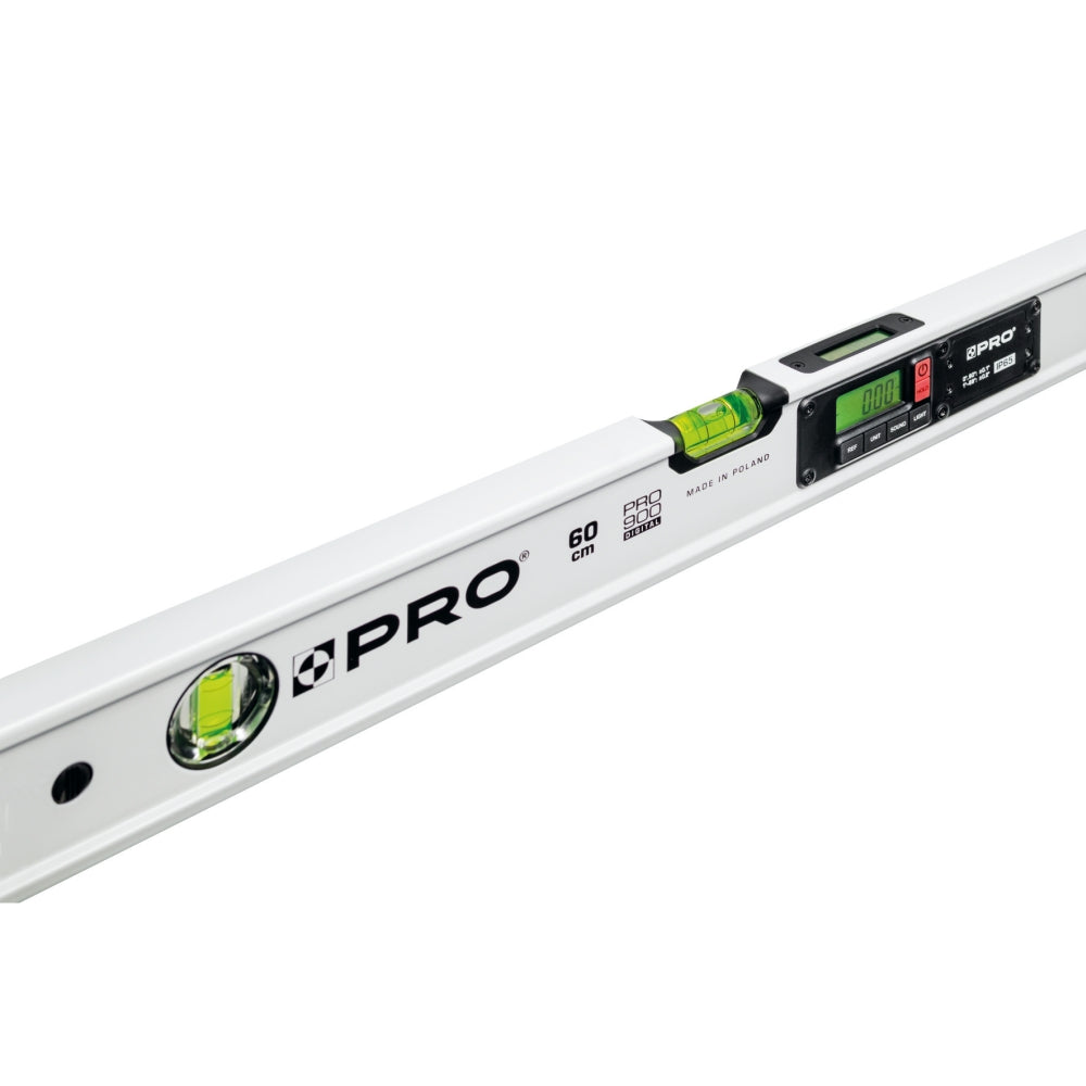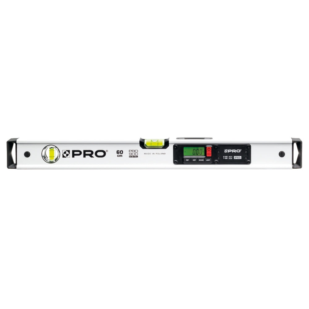 PRO digitala vattenpass är ett extra kraftigt digitalt proffsvattenpass. IP65 klassat i trekammar aluminiumprofil med dubbla tydligt belysta LCD displayer samt kraftiga neodym magneter och avtagbara gummerade stötupptagande ändkapslar. Avsett för daglig användning inom bygg och industri som ställer höga krav på tillförlitlighet och hållbarhet.