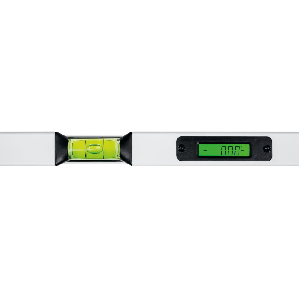 Försedd med dubbla upphängningshål. Noggrannhet av elektronisk lutningsmätning; vid 0 och 90°: +/- 0,1°. Från 1 till 89°: +/- 0,2°. Noggrannhet libeller är 0,5 mm/m. Fastsättning och nivellering av de okrossbara libellerna i aluminiumprofilen sker elektroniskt. Libellernas utformning möjliggör även avläsning runt om. Elektrostatiskt pulverlackerad aluminiumprofil avsedd för högsta belastning för optimal noggrannhet och slitstyrka.
