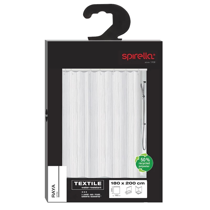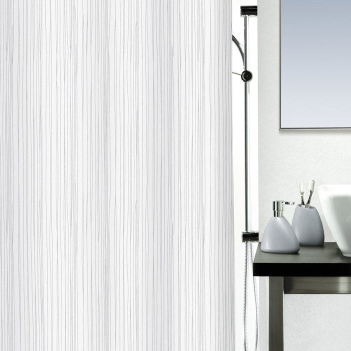 Duschdraperi i textil som är tillverkat i 100 % polyester. Tyngdband är insytt i draperiets nederkant som gör att draperiet håller sig på plats när man duschar.