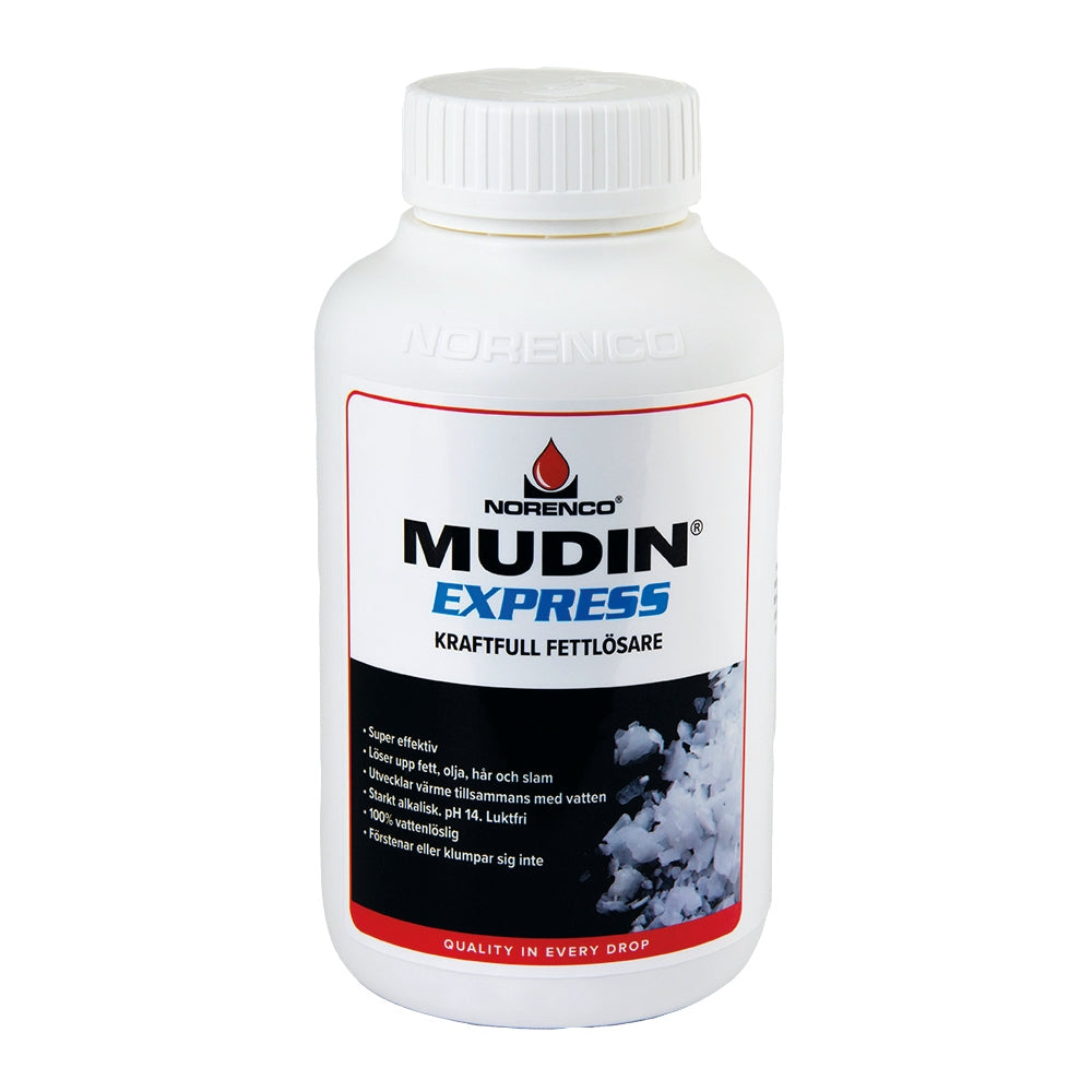 - Kraftig grovrengöring för att lösa upp fett och slam, hår och organiska material, oljiga betonggolv: 5 dl MUDIN Express per 5 liter kallt vatten.