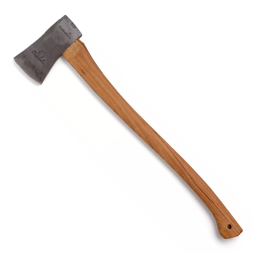 Blästrat och klarlackat smide. Lämplig för trädfällning i mindre omfattning. Svängt skaft av hickory.