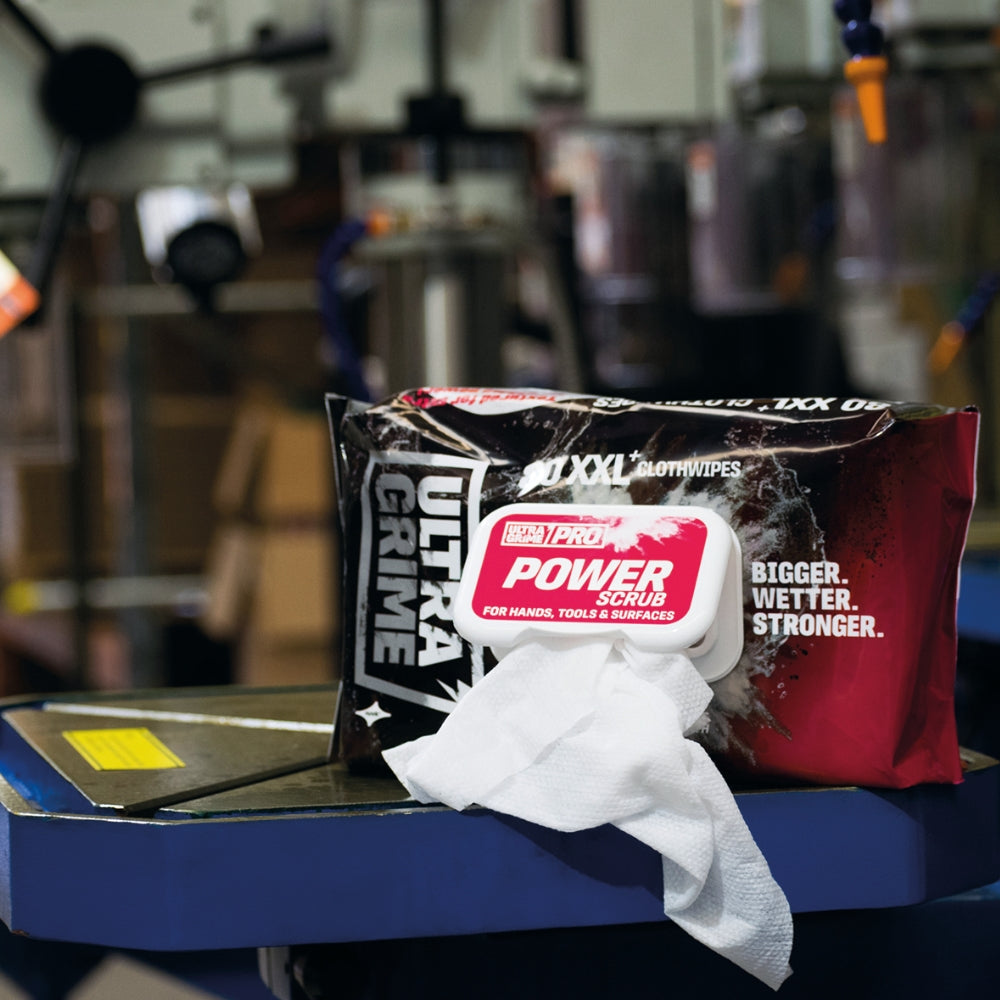 UltraGrime Pro Power Scrub XXL är utmärkt rengöringsduk för riktigt hårt sittande smuts. Med en kraftigare struktur och två sidor – en grov skrubbsida och en finare yta – får du både kraft och kontroll i varje torkning. Effektiv på händer, verktyg och ytor, helt utan behov av vatten.