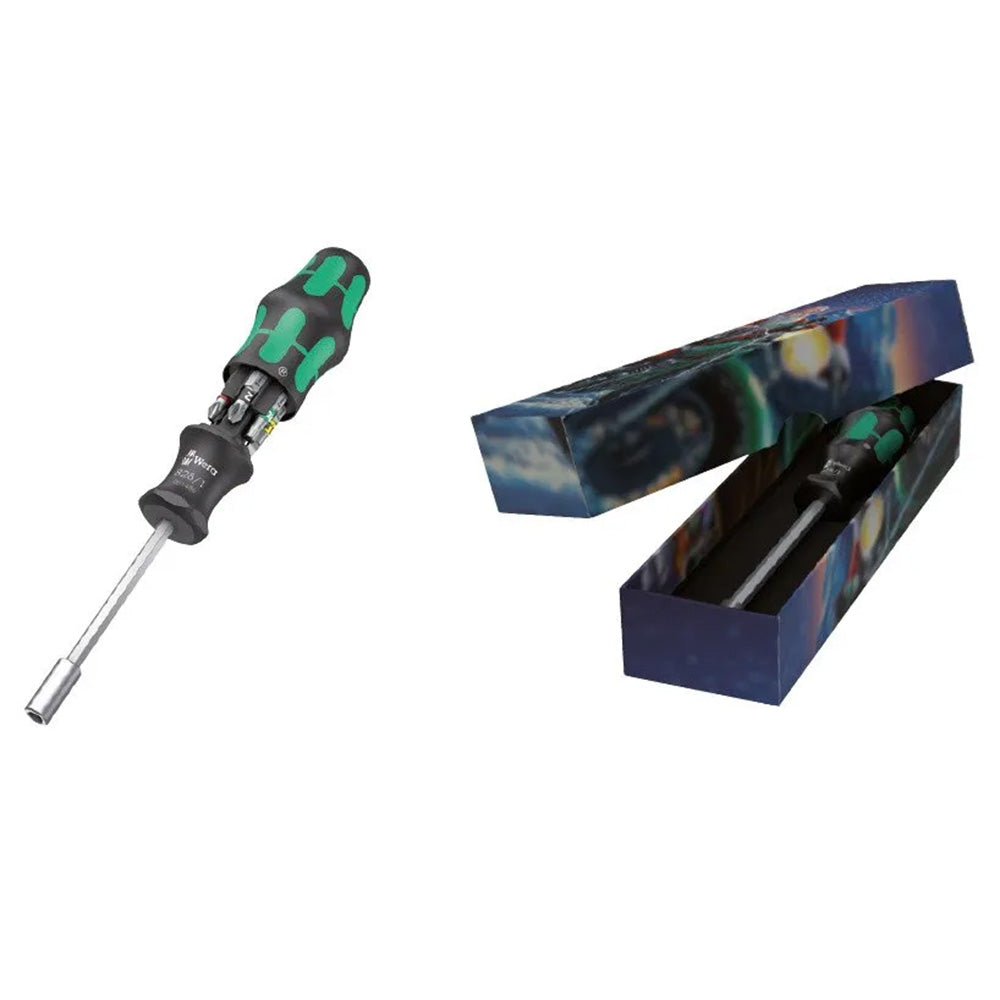 Handtaget har ett inbyggt magasin som rymmer sex BiTorsion-bits – Phillips, Pozidriv, TORX® och spår – slitstarka och redo för alla uppgifter. Den starka magneten i hållaren ser till att bitsen sitter stadigt på plats, samtidigt som Weras ergonomiska Kraftform-handtag ger ett säkert och bekvämt grepp även vid längre arbetspass.