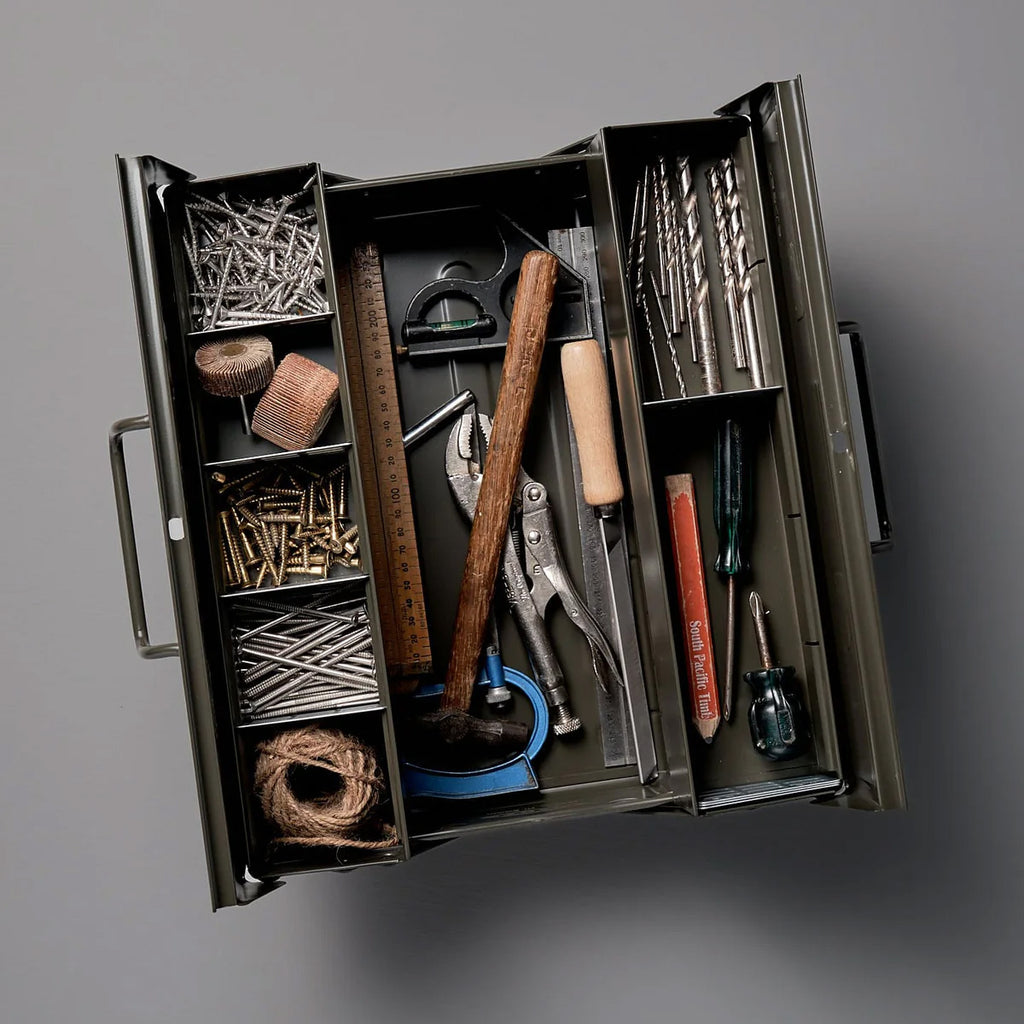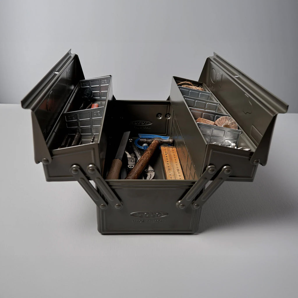 Snygg och praktisk förvaring för verktyg, redskap eller precis vad som helst. Japanskt hantverk och design möts i en ”vill ha”-produkt. ST-350 är en klassisk modell i två våningar. Ett stort nedre fack och två mindre längst upp. De övre våningsplanen kan delas i upp till 5 små fack per sida. Gör den till en välordnad verktygslåda, fiskelåda, sylåda, målarlåda eller legolåda.
